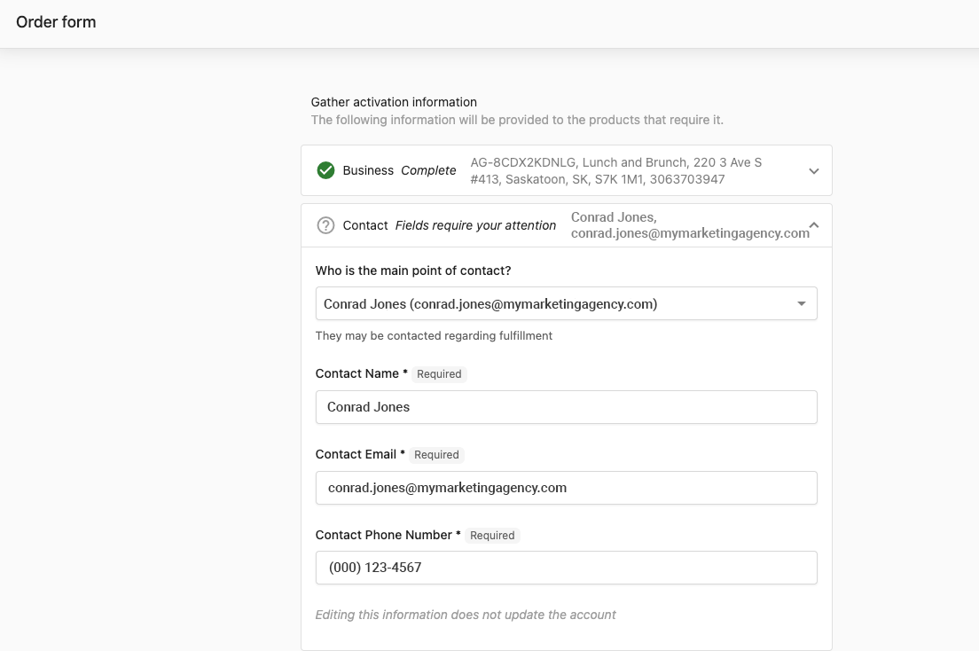 After completing a sale and activating the desired Marketing Services products, we send a confirmation email to the contact(s) listed on the sales order and fulfillment form. Please ensure accurate contact information on these forms.